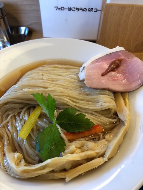 透明なスープにきれいに畳まれた細麺、茗荷、紫玉葱、刻み海苔、ミツバ、穂先メンマ、豚チャーシューが乗ってます。豚チャーシューの上にはオリーブオイルとアンチョビがトッピングされてます。