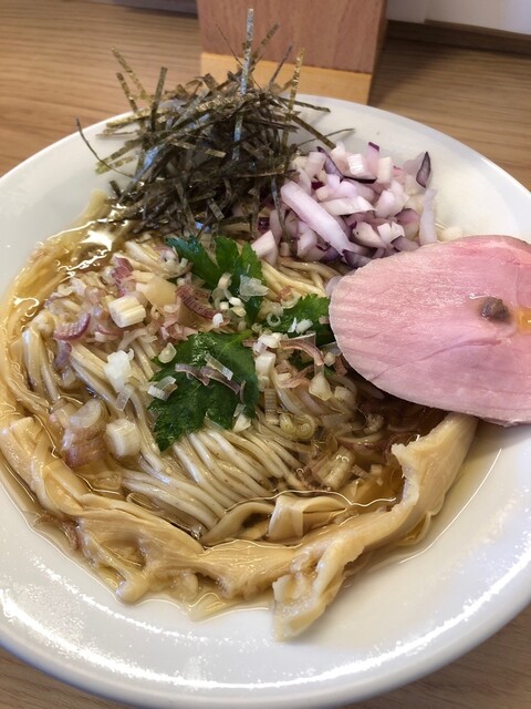 玉葱や茗荷がたっぷりで麺を食べ終わったあと、煮干香る塩味高めのスープと一緒にいただくと、コリコリ食感と玉葱の甘み、茗荷の清涼感で最後の一滴まで楽しめました。