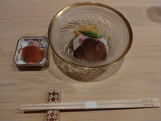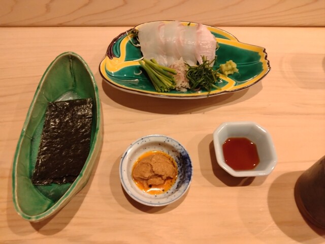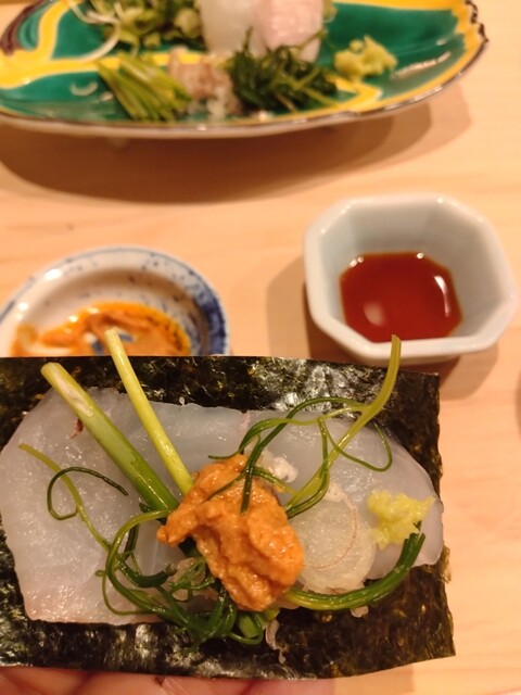 海苔にのせて薬味とあん肝で食べるおつくり。