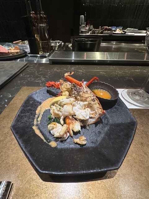 ・A5ランク黒毛和牛湯引き 胡麻柚七味の香り ・サーモンの香味マリネ、牛の生ハムと果実 ・鮪赤身の炙り アヴォカドのピュレ ・大伊勢海老の鉄板焼き ・フォアグラのソテー 香辛の甘味と金箔ソース ・最高ランクA5山形牛サーロイン+季節の野菜 ・ガーリックライス ・しじみの味噌汁 ・フレンチトーストとバニラアイス ・コーヒー