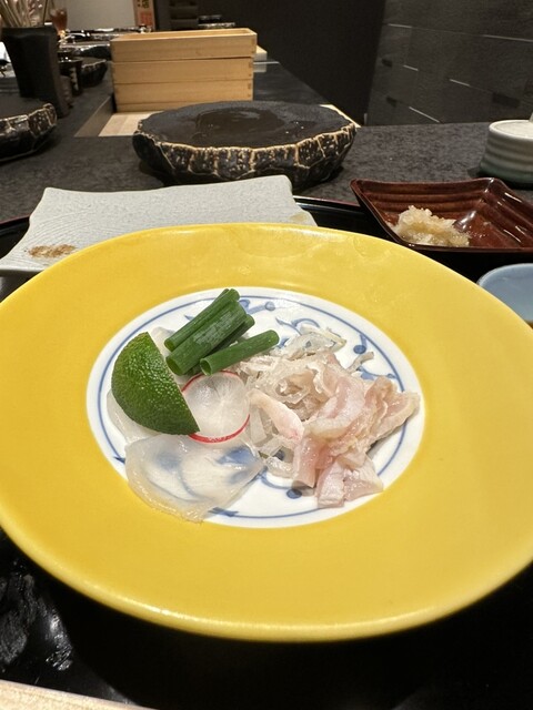 先付: カニ身カニ酢ジュレ、白子、フグの煮こごり、タコ