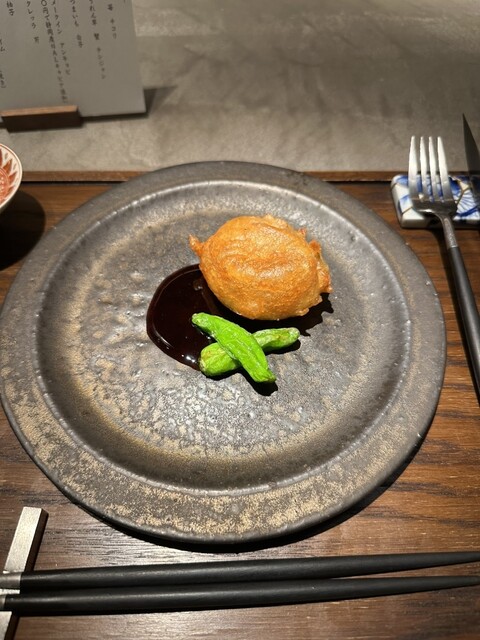 魚料理はさらに鱈と蛤、柚子。重くなりがちな脂を持つ冬の魚を、出汁と柑橘で軽やかにまとめています。お客さん全員、蛤のお出汁に大絶賛。肉料理では天草大王(鶏肉)のフリットに蓮根とタイム。今までの流れから、揚げ物で角度を変えるのはあり。締めのご飯は、旨みある黒豚にフォアグラとたっぷりのちりめんキャベツを混ぜて。濃厚さを感じながら、お酒で洗い流す気持ちよさ。残りはおにぎりとしてお土産に。デザートはアーモンドソースを添えた文旦入りのパイ。加賀棒茶とともに余韻をすっと切る構成です。