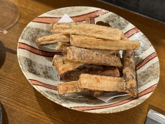 極太ごぼうの拍子木切りが丸ごと片栗粉塗しで揚げてある。しかもごぼうは恐らく事前に出汁醤油で軽く煮込んであると思われ、噛むとジャワっと旨みが広がる。酒が止まらない味