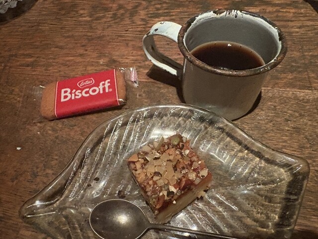ポテトはカリッとあげられて、かなり濃い味付けでこれもお酒に合う。サーロイン寿司は肉の脂しっかりと感じるとろけるうまみ。八丁味噌も味が濃ゆく付け合わせのパンひたひたに食べるのがよき。最後にバスケットに入ったコーヒーとお茶菓子がでてくるのがよきかな。