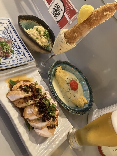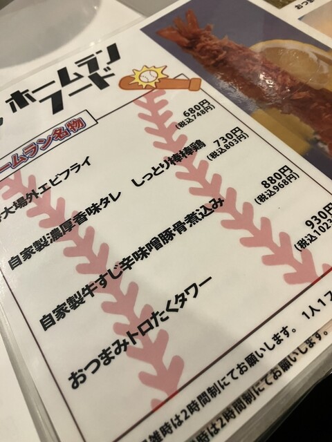 プレイボールが乾杯の挨拶と、野球好きのお店なのでしょうか?エビフライの名前も特大場外エビフライ。インスタ映えするし、頼んで損はないかと思います。他にもポテトサラダやしっとり棒棒鶏、明太子クリームふわとろ卵が美味しかったです。場所が福しんの横の階段を降りたところで少し分かりにくいし入りにくいところもありますが、入るとネオンな内装と野球のユニホームなどもありオシャレな感じでした。15時から17時は、ハイボールやレモンサワーが99円で飲めるので、まずは、そちらで試すのもありかと思います。ただお通しと1品は頼まないとダメみたいです。