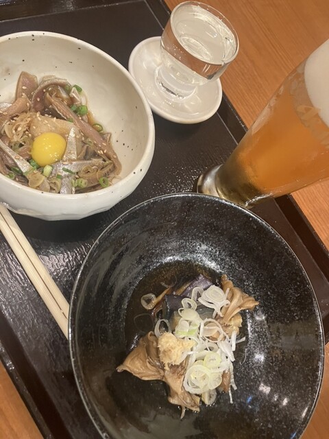 ジャズが流れている蕎麦屋さん。ちょい飲みセットとちょい飲み月見セットという言葉に惹かれて入ってしまった。ちょい飲みセットはアルコール類が1杯とおまかせつまみ2品、おまかせ天ぷら3品で1280円、なかなかお得。そしてちょい飲み月見セットは、ビールと日本酒、そしてナスときのこの揚げびたしと鰯のたたきで1580円、これ迷うところですよね。どっちも絶妙な値段設定。蕎麦には日本酒かなぁ、と思ってちょい飲み月見セットにしました。、これ、この後にミニかけ蕎麦を330円で注文できる。うーん、こういうのも良いですよね。天ぷらも単品を300円前後で頼めるのも良い。結局、ミニかけ蕎麦注文しないで、結構ほろ酔いで会計しました。で、会計時にガムと次回アルコールがただになる券をもらえるんだけど、使用期間も長めなのでまた行ってしまう気がする。ちょい飲みの選択としてはありですね。15時以降からの利用です。あ、つまみや天ぷらも美味しかったので蕎麦も美味しいと思います。。。