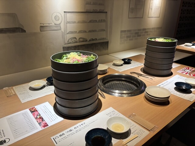 6段に積まれたお皿を上から順番に楽しむスタイル、サラダやおつまみ、お肉も順々に、焼き方は詳しく書かれた説明書を読みながら自分で焼いて行きます。焼き時間も記載され、皆んなで体験していくのもとても楽しい、思わず写真を撮り忘れてしまったお皿ばかり。