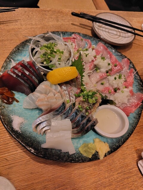 刺身の盛り合わせは、鰹はニンニクの醤油漬けと一緒に食べたり、鬼おろしと巻いて食べるものや酢を付けると甘みを感じるなめろうなど凝っていて、
