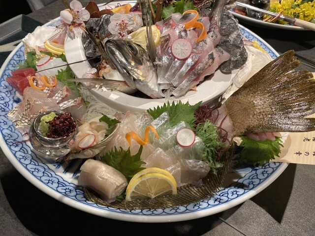 前菜から盛り付けがとても洒落ていてこれまでにない美を感じたが、鯛の塩焼きと活魚盛り合わせの着膳で圧倒されてしまった。また活魚は伊勢海老、関鯖、本マグロ、鮑、平目、鯵等の鮮魚が勢揃いで、特に盛り付けが美しく、食して鮮度抜群で、これまでに経験のない最高の活魚料理を頂くことができ感無量!〆のデザートまで全ての料理が絶品で忘れることができない思い出の会食となった。