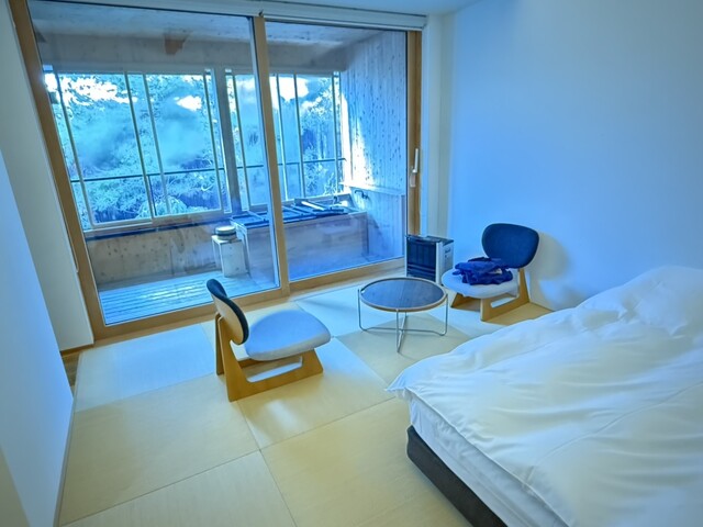 チェックイン後に店主による蕎麦打ちがあるとのことで見学させてもらいながら、当館に関する説明を彼是伺うことができた。純米酒を幾種か試飲しながら和やかなひと時で、手打ち蕎麦は夕食に提供されることになる。