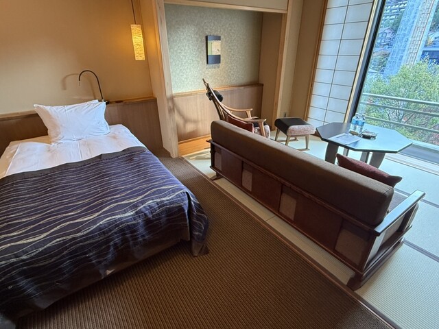秋の味覚松茸がふんだんに使用された会席料理で味わいは全て絶品。好みの一品は4品から"神戸牛の陶板焼き"と連れは"鮑の陶板焼き"を選択しシェアすることにした。のどぐろの柚庵焼きや〆の松茸の釜炊きご飯に至るまで終始満足度高い料理を頂くことができたよう。翌朝食も品数豊富で焼物や煮物などどれも美味しく頂いた。施設の充実度、サービス内容等、規模の大きさにも拘らず全てにおいて徹底されているといった印象で、安心して快適に過ごせるところだと感じられた。