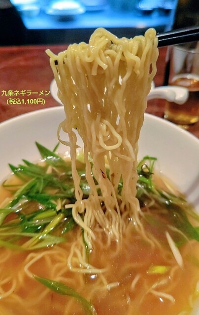 『九条ネギラーメン』⇒スープはあっさりとした醤油ベースの上品な味わい。鮮やかな緑色の九条ネギは、独特の風味と食感。麺は細めのストレート麺で、スープによく絡み、すすり心地が良い。素材の良さが際立つラーメンで締めにピッタリ。