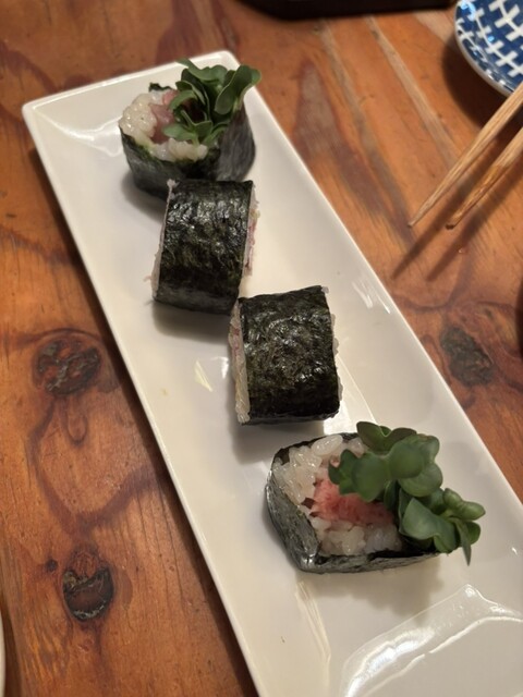 フードメニューは、築地が近いこともあって海鮮がメインのお店のようです。最初に頼んだ生しらすととろたく巻きは、生しらすにまったく苦味がなく、とても新鮮な味わい。鰹も脂がしっかり乗っていて、お酒との相性が抜群でした。