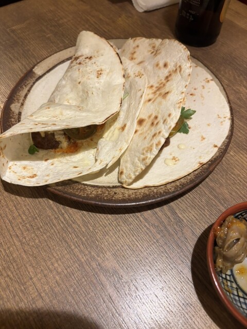 注文した砂肝のマサラコンフィは、丁寧な味付けにスパイスがしっかりと効いた一品。タコスもボリューミーで味だけでなく満足のいく一品でした。