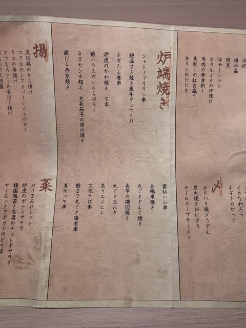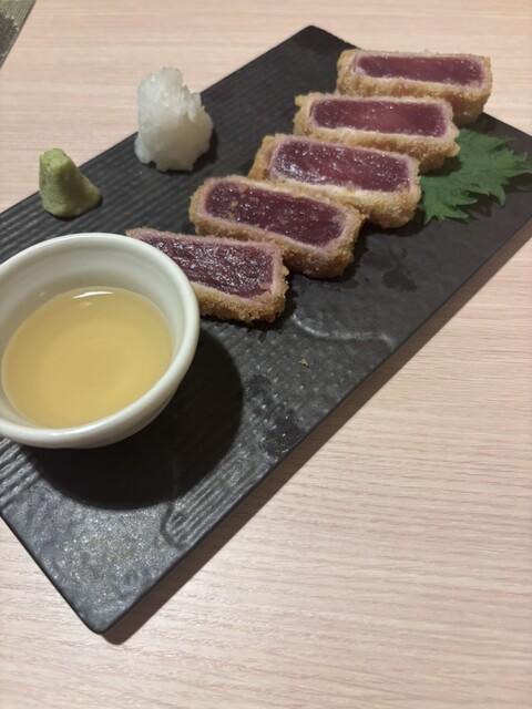 「牛タンのたたき」は柔らかく旨味濃厚、「マグロのレアカツ」はレア感を残した絶妙な火入れで満足度が高い一品。締めの炭火焼きおにぎりまで抜かりなく、デザートの「くまさんの最中」や黒蜜きな粉アイスで最後まで楽しめました。