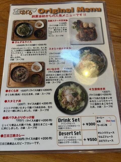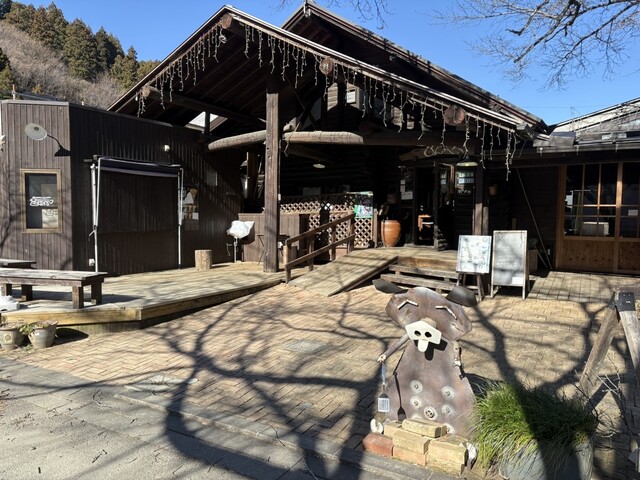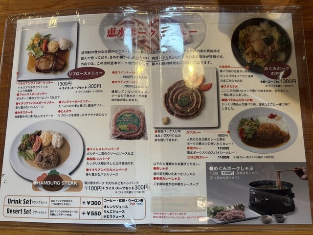 靴を脱ぎ、木の温もりしか無い店内で丸太椅子に案内、残り半分は座敷でした。メニューは名物丹沢恵水ポーク使用のリブローズステーキ、ハンバーグ、ソーセージかスタミナ丼。あとはピザや馬肉丼もありました。