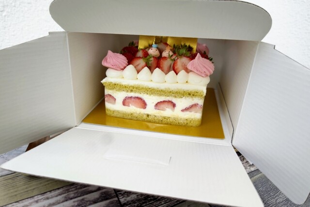 ひなまつりケーキは四角いガトーシャンティーに沢山のイチゴとシュガーのお雛様とお内裏様が乗っています。