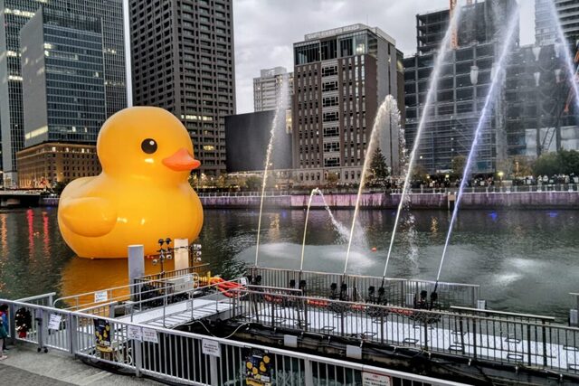 堂島浜のラバーダッグ。雨がふってきて新ダイビルに到着。