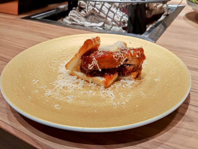 金色のお皿にヒレとフォアグラのロッシーニサンドに韓国ソース、削りたてのチーズがかけられた一皿!