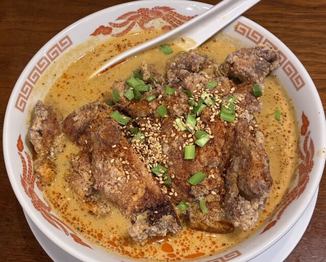 どんぶりを覆い隠すような鳥のから揚げの大きさに驚きました。麺が見えない!ただ大きいだけじゃない。とても美味しい。