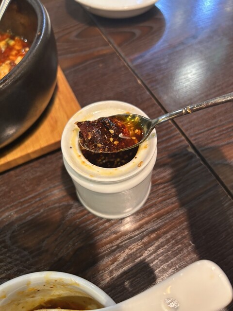 そして最大のサプライズは、卓上ラー油。ひとさじ加えた瞬間、ふわりと八角の甘くエキゾチックな香りが広がり、味わいが一気に別次元へ。口に含むと甘みがじんわりと広がり、時折現れる甘い塊がアクセントになって、辛さとのコントラストがたまらない。辛味の輪郭はそのままに、香りと甘みが重なって、麻婆豆腐がまるで別の料理に変化したような感覚。中華好きを自負していたものの、これは新たなる世界の幕開け。