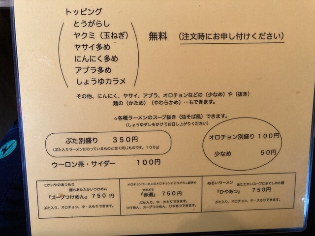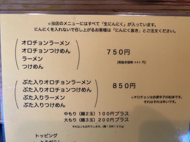 ぶた入りラーメン850円、オロチョン別盛り少なめ50円注文。