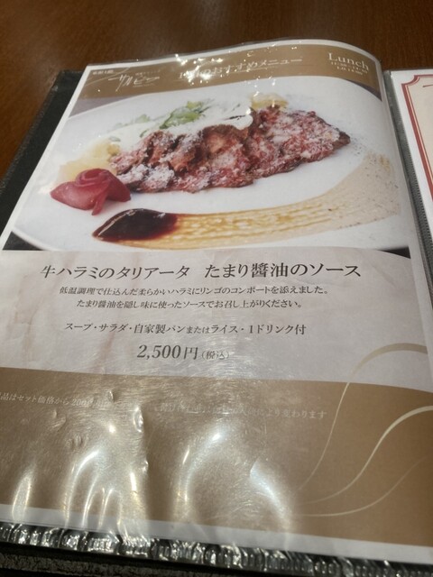 同伴者は11月のおすすめメニュー(季節限定)の「牛ハラミのタリアータ たまり醤油のソース」2500円を注文。