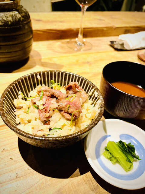 牛肉とマッシュルームの土鍋ご飯が締めとして出てきたが