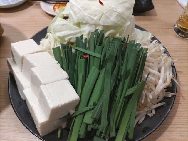 二色鍋の出汁は辛いの(名前忘れた)と黒醤油をオーダー、具材はモツと豚肉。