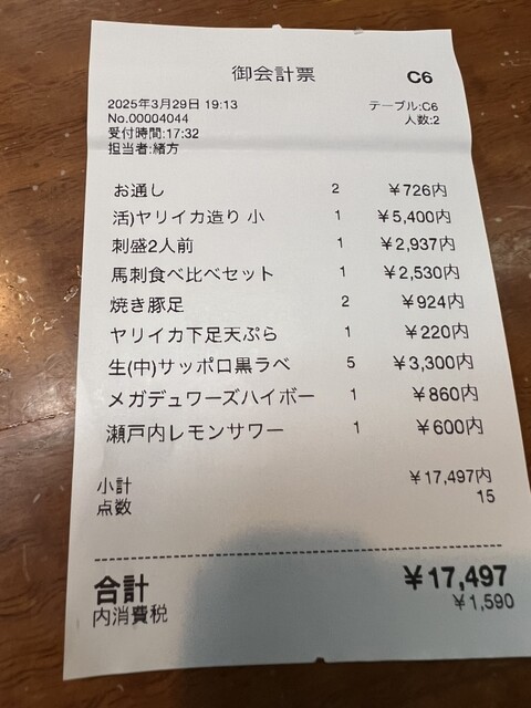 出て来たイカは2人には大きすぎるくらいの立派な物でびっくり。でもお会計の時確認したら¥5000。せっかく旅行に来たのだから想定内。