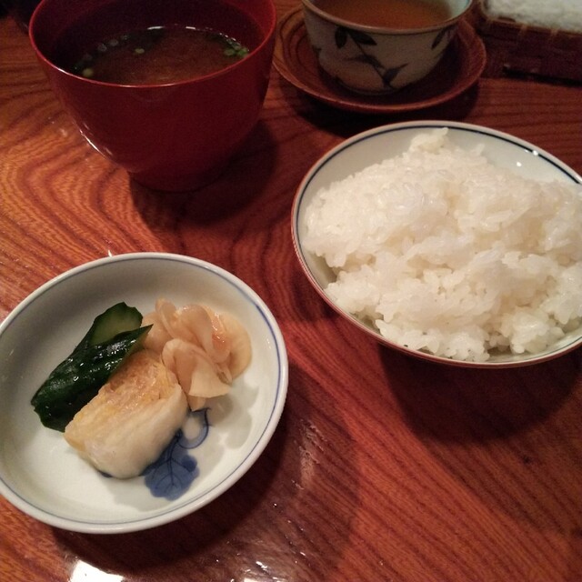 ご飯セットは別注文で少しイラっとするんだけど、飯も味噌汁もお新香も全て高レベル。このレベルのご飯セットなら納得するしかないわ。