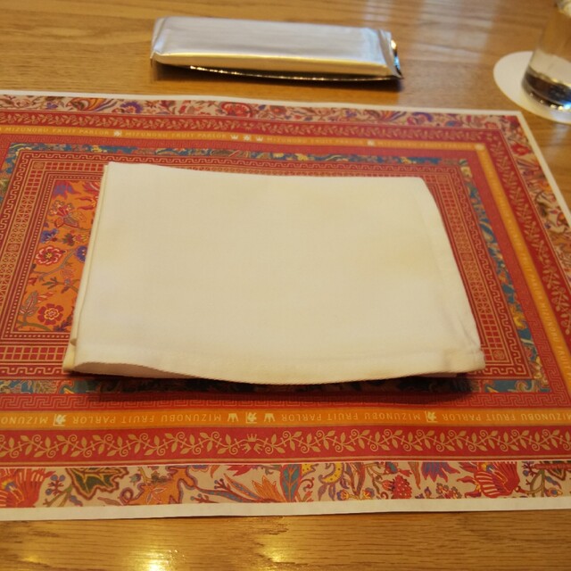 ナプキンは フルーツパーラーでは珍しい布ナプキン。いや、資生堂パーラーぐらいでしか見た事ないぞ!
