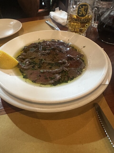 写真は前菜、メイン料理でトマトとルッコラのサラダ、牛もも肉の温製カルパッチョ、ホウボウのアクアパッツァ。ビールワインが止まりませんでした。