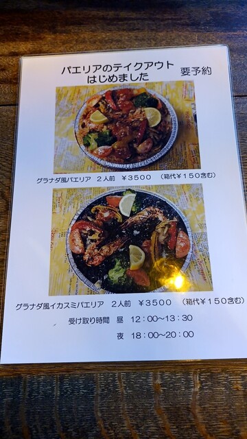 日曜日のランチで利用しました。11時30分からの営業で開店と同時に入店しました。「えび・いか・あさりのトマト煮(1350円)」・「グラナダ風パエリア(サラダ・スープ付)2人前3350円」を注文しました。パエリアは時間がかかりますが、15分程での提供となりました。近くにあれば、通いたくなるお店です。