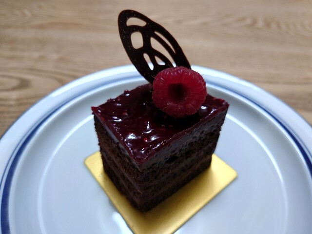 今回は朝早く伺ったこともあり、ショーケースもケーキが満タン。メインのフレジェに惹かれましたが、フランボワーズとチョコレートのケーキから呼ばれてこちらを購入。たまりません
