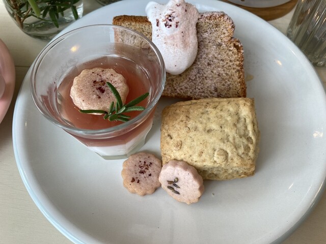 シフォンケーキ、ゼリー、スコーン、クッキーと体調に合わせたハーブティ