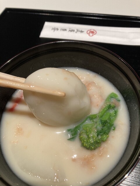 夕方の来店でしたが、お目当てのお雑煮は幸いにもまだ用意ができるとのことでそちらと銀座店オリジナルのお茶のセットを注文しました。15〜20分ほどしてお雑煮が提供されました。お椀を開けるとかつお節が踊っておりお出汁の香りがフワッと感じられました。