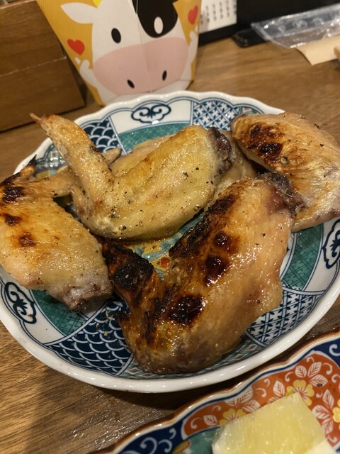 旨塩手羽は香ばしく焼き上がり、塩の加減がちょうどよく、お酒の進む味わい。
