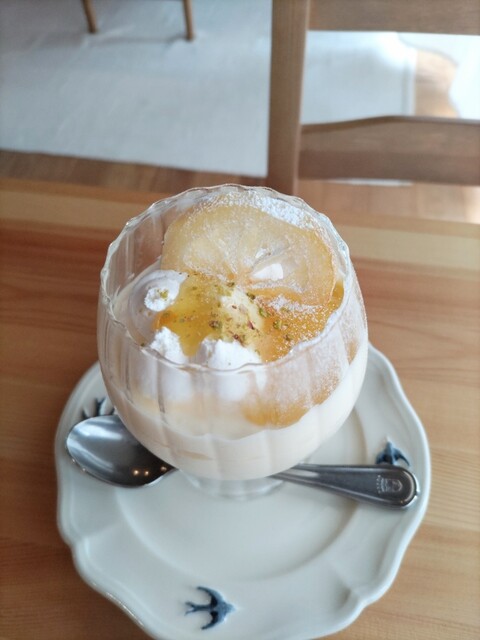 一昨年と昨年の秋に紫芋のモンブランパフェをいただいてますが、栗はまだ食べたことなくてラ・フランス共に今回初です♪シャインマスカットといちじくの旬が終わり、もうすぐやってくるイチゴシーズンまでのわずかな期間のラ・フランス。あまり食べる機会がないですが、大好きな果物の一つです。パフェの構成は以下になります。