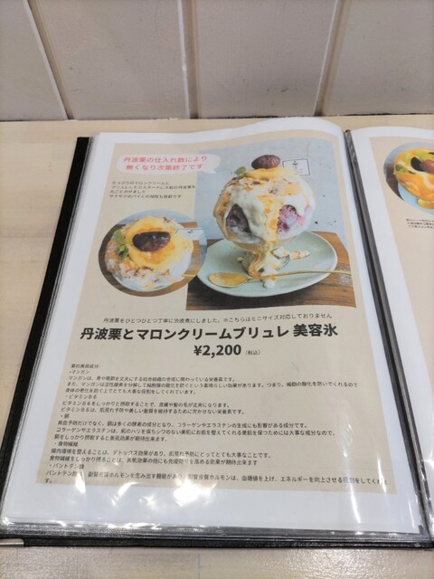 2杯目丹波栗とマロンクリームブリュレ。トップに栗の渋皮煮、ブリュレしたカスタード、マロンクリーム、パイ。ベースはたぶんブルーベリーだと思う(笑)栗はお皿に降ろして先に氷を食べてから最後にじっくり味わうのがオススメ。ブリュレすることでまた違った味わいになりいい感じ☆パイは氷に包まれているのにしなしなにならずサクサクのまま!(食べるの早いからかもw)とにかく最初から最後までおいしいーーーっ(((o(*゚∀゚*)o)))モンブランのかき氷はあまり好まないけど、栗クリームの氷は好きだなぁと改めて思いました。