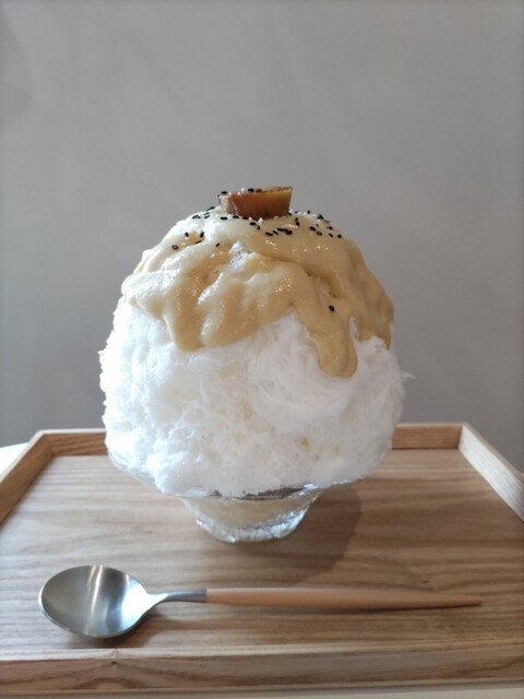 1杯目焼き芋かき氷。安納芋を焼き芋にしてからシロップにしたとのこと。こってりしたシロップと甘さがドストライク\(^o^)/これは東京のひみつ堂さんのさつまいも氷に近いかも!中にも入ってますよ。トップのごま塩が良い仕事してますね◎あとはミルクベース、きめ細かい削りが奈良で食べるかき氷そのもの!最初からクオリティの高さに感激(((o(*゚∀゚*)o)))
