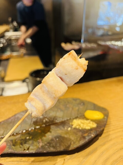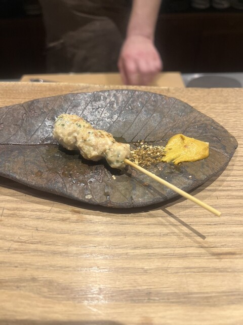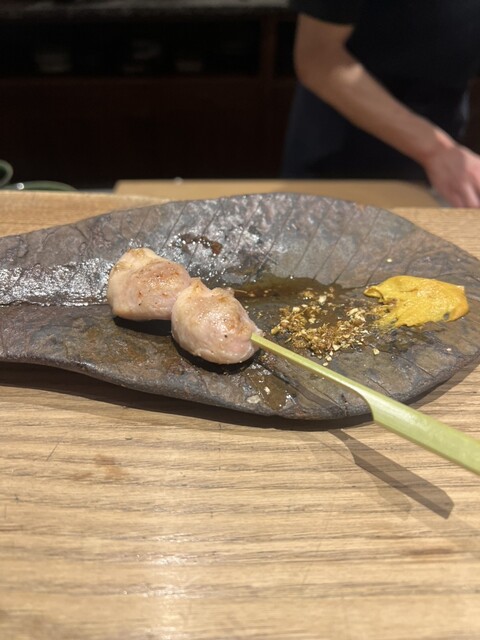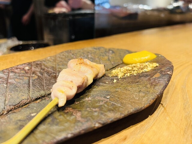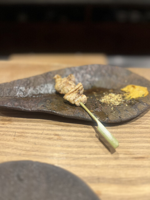 最初に出てくるモモのタタキは本当に絶妙な火入れ加減で、一つずつ炭火台で丁寧に焼いて余分なところはカットしてじっくり焼いて提供されます。皮目はパリッパリで嫌な感じゼロです、モモの部分はジューシーで柔らかくて最高です。