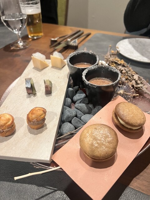 5種のアミューズ あんぽ柿のムースとコウイカの最中とカカオポタージュというチョコのスープが特に美味でした