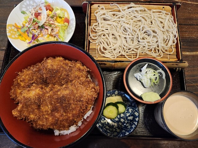初わらじカツ丼&くるみそば カツがタレにつけてあるのにサクサクでおいしい!くるみ汁×そば湯も絶品♬