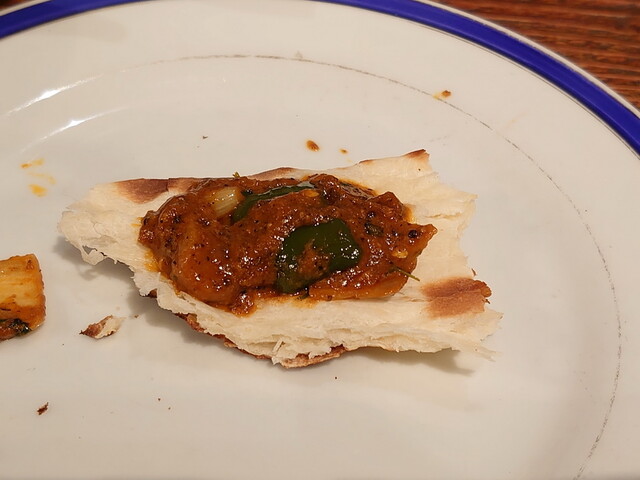 マトンも臭くなく、スパイスによく合って、、たまに口に入る青トウガラシも香ばしく、