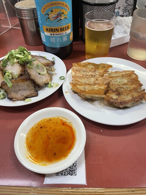 オモウマイで見て気になってたお店。夜移動で遅くまで空いてるから行ってみた。21時前だったけどタイミングよく並んでおらずスッと入れました。生よりはここは街中華ならと謎の自分ルールで瓶ビールを注文。瓶ビールの種類が多いのもGOOD。餃子とチャーシューを頼んでつまみながら厨房ライブを眺めるのは楽しかったです。だいぶ元気なスタッフのおじさんに元気をもらいつつ2本目瓶ビールと醤油ラーメン。博多なのに…と思いましたが、麺細くて、替え玉できるのは博多ならではですね。あと引くスープは大変美味しかったです!この店は飲んだ後だな…。