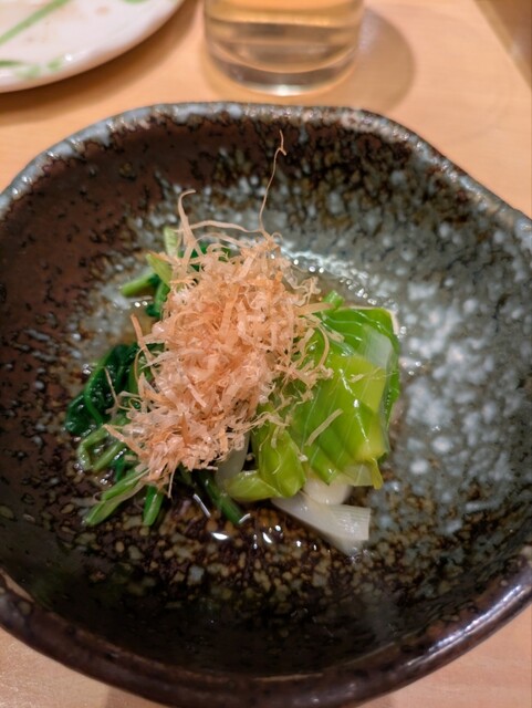 次に煮物、焼き物とそれぞれの3〜5種類の中から1品チョイスします。煮物→壬生菜とウルイの煮物、アワビの柔らか煮などもありました。焼物→