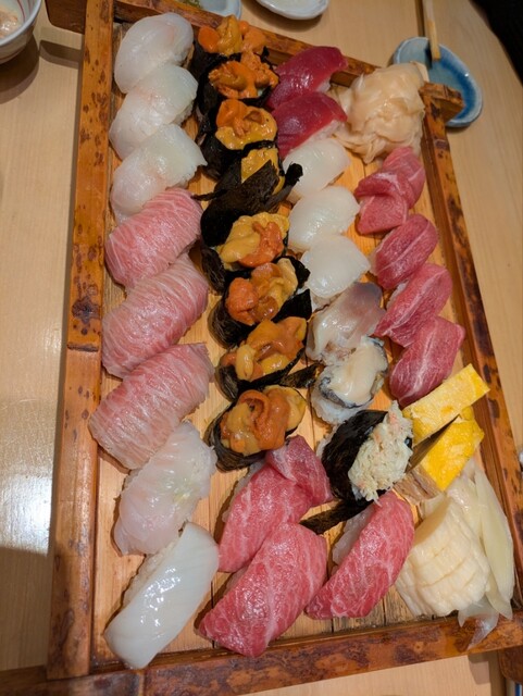 ウニとボタン海老は1人二貫までで、あとは食べ放題です。残念ながらボタン海老は終了してしまいました。ウニ、いくら軍艦、まぐろのかま、赤身、中トロ、大トロ、ひらめ、穴子、トロ鉄火やねぎトロ巻などなど、好きなネタを何回もリピートしてお腹いっぱいいただき大満足です。