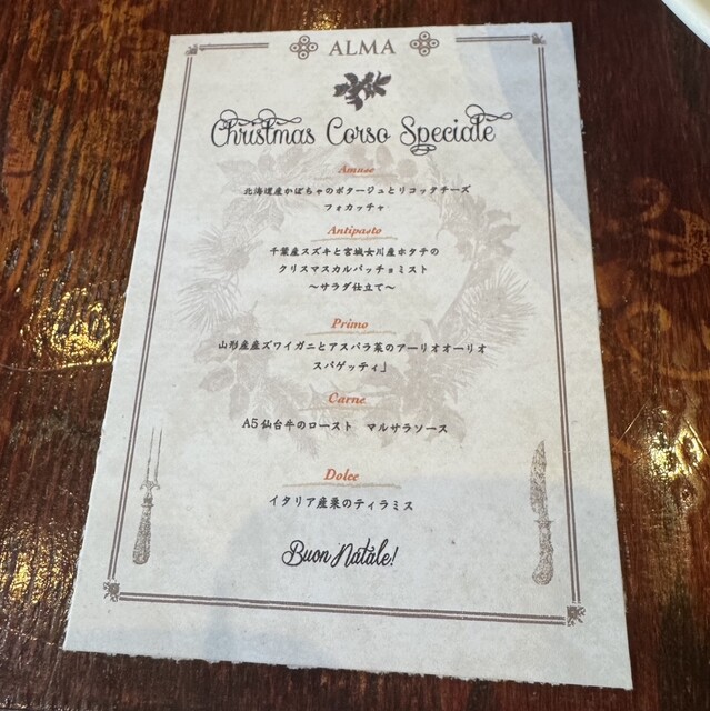 クリスマスコース(5,800円)のスペシャルランチを予約して伺いました。ソフトドリンク(1,200円)を足し、約7,000円/1名でした。