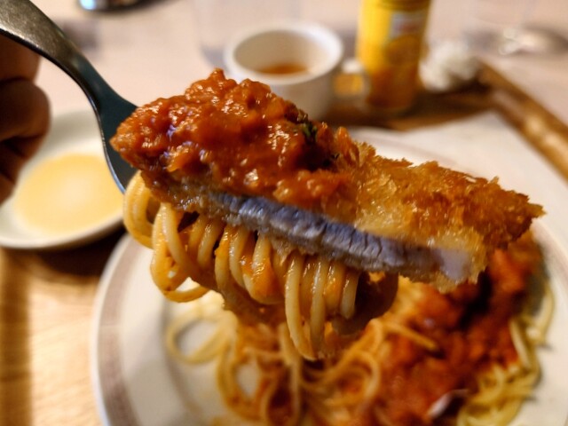 『スパゲティミートソースカツのせ』の厨房略名が、お客さんにも定着した、とのこと。
